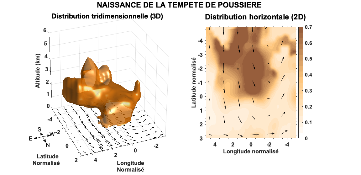 Les vastes quantités de poussières soulevées au Sahara modifient fortement les bilans énergétiques terrestres, les processus biogéochimiques, la circulation atmosphérique, la qualité de l’air et la visibilité en Afrique du Nord, mais aussi bien au-delà lorsque les vents les transportent à des milliers de kilomètres. Les tempêtes de poussière sont déclenchées par des mécanismes dynamiques complexes et sporadiques. Leurs naissances sont très mal documentées, étant donné les moyens d’investigation très limités dans les régions désertiques. Les scientifiques étudient les quantités de poussières soulevées dans l’atmosphère et leur parcours vers d’autres régions à partir des observations satellitaires. Or, jusqu’à présent, les mesures satellitaires classiques ne caractérisaient que la répartition bidimensionnelle (2D) des poussières désertiques, soit par une cartographie horizontale, soit par des profils verticaux des poussières uniquement le long de transects.